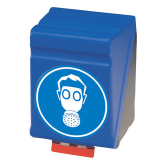 Aufbewahrungsbox für Atemschutzmasken, passend für Halb- und Vollmasken. Sichere und saubere Aubewahrung, aus starkem ABS hergestellt, Kippöffnung zur raschen Entnahme. Für Wandmontage, Farbe blau/schwarz, Masse: 23.6 x 31.5 x 20 cm
