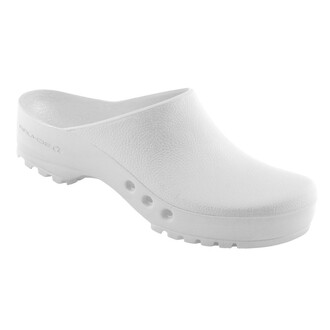 Made of lightweight polyurethane in wide and comfortable design. Raised heel, washable and disinfectable up to 85°C, side ventilation holes, anatomical footbed with toe grip provides secure hold, antistatic, Tested according to EN ISO 20347:2012 SRC.