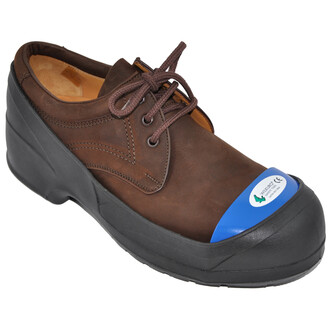 Turbo-toe safety overshoe, ideal for visitors or short use, robust and large steel caps, hygienic and easy to use, anti-slip PVC sole, in six different sizes with colour coding.