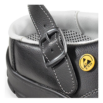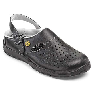 Mule ESD sportive à perforations, tige en microfibre, noir, lanière de talon rabattable vers l'avant, doublure textile DRY-TEC souple, semelle intérieure PUR confortable, semelle PUR antidérapante, antistatique, protection ESD max. 35 M-Ohm.
